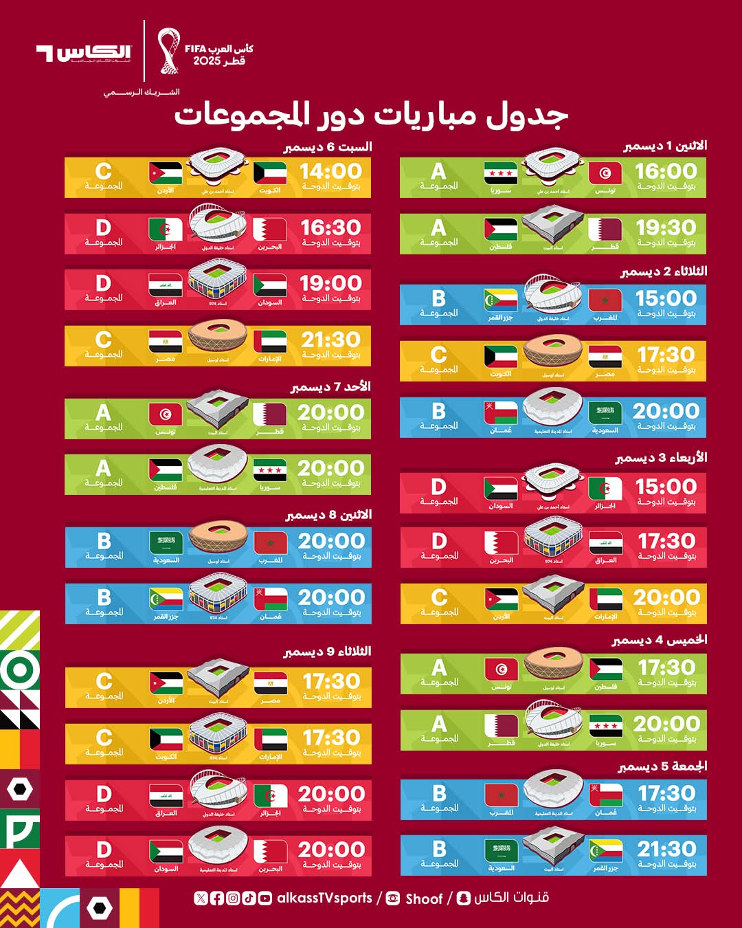 شاهد وتعرف على مواعيد مباريات دور المجموعات في كأس العرب 2025.